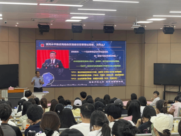 郝教授深入剖析了新质生产力的理论溯源与内涵,并对海南自贸港建设的基础与条件进行了梳理。他指出海南自贸港建设面临巨大挑战,破局之道在于探索新质生产力发展路径,一方面,要在世界经济地理格局变迁中捕捉海南在全球贸易网络中的新机遇;另一方面,要在解决我国新质生产力发展痛点中确定机遇。面对以创新驱动、科技赋能为核心的新质生产力蓬勃发展态势,结合海南自贸港建设中对跨境贸易数字化转型、国际旅游消费创新升级、现代海洋产业体系构建等战略需求,郝教授从培育复合型人才的视角,对当代大学生提出“以专业知识为帆,以创新实践为桨”的殷切期望,希望青年大学生在海南自贸港建设的大潮中能挺膺担当,贡献自己的青春力量。